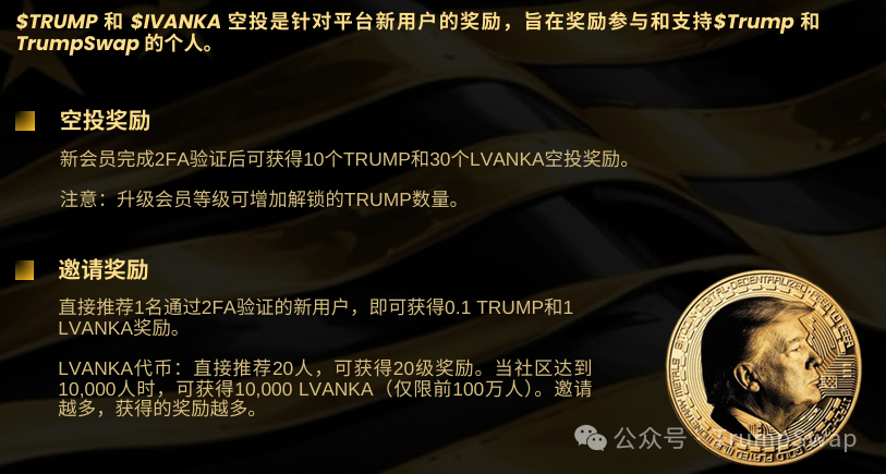 新用户注册:完成2FA验证,立即领取10枚TRUMP和30枚LVANKA代币。