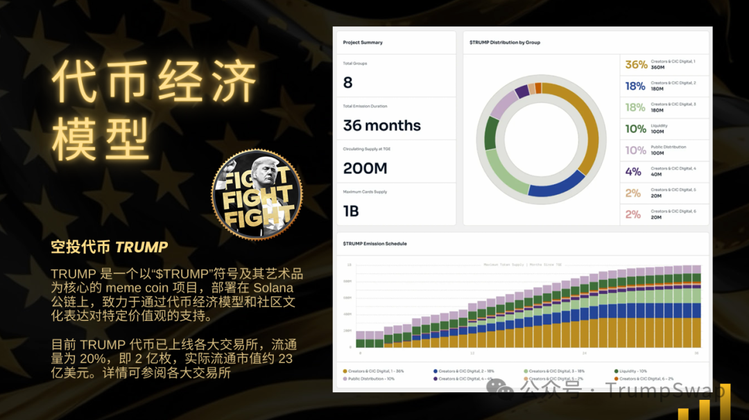 TRUMP 是一个以“$TRUMP”符号及其艺术品为核心的 meme coin 项目,部署在 Solana公链上,致力于通过代币经济模型和社区文化表达对特定价值观的支持。