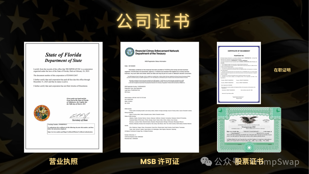 TrumpSwap已正式通过美国佛罗里达州政府及财政部金融网络(FinCEN)的严格审核,成功取得多项权威认证与牌照,所有智能合约及财务流程均通过第三方审计,严格遵循 FinCEN 监管要求,杜绝任何潜在风险。