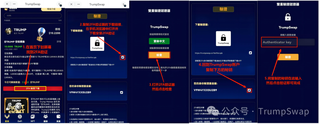 3.打开您的TrumpSwap账户,复制12位密钥,在2FA验证APP上进行绑定。